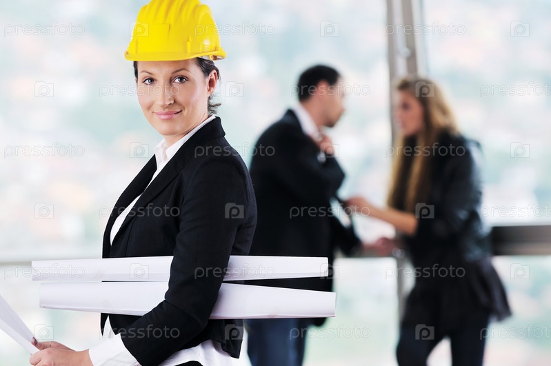 Агент по недвижимости в каске с чертежами и молодая семейная пара в новой квартире