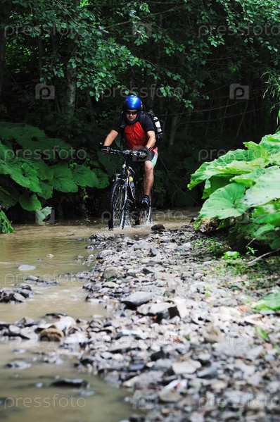 Мужчина на велосипеде едет по реке