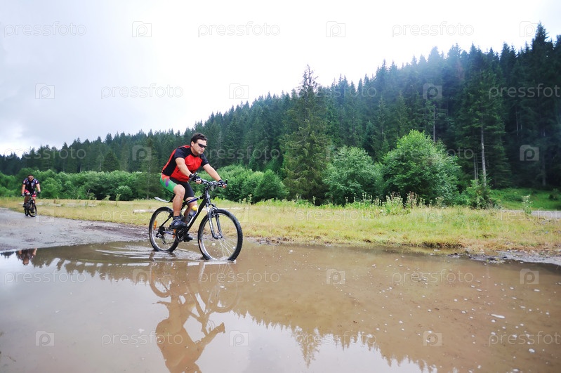Мужчины на велосипедах едут по реке