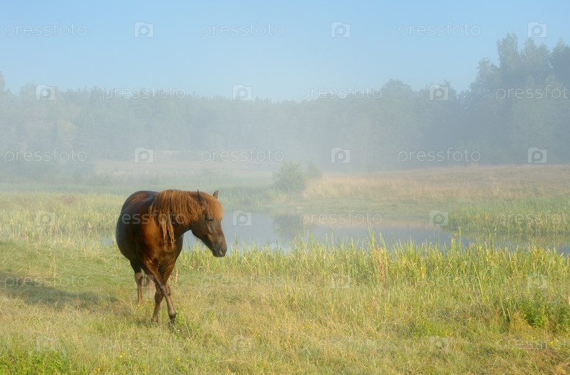 Лошадь пасется на берегу озера