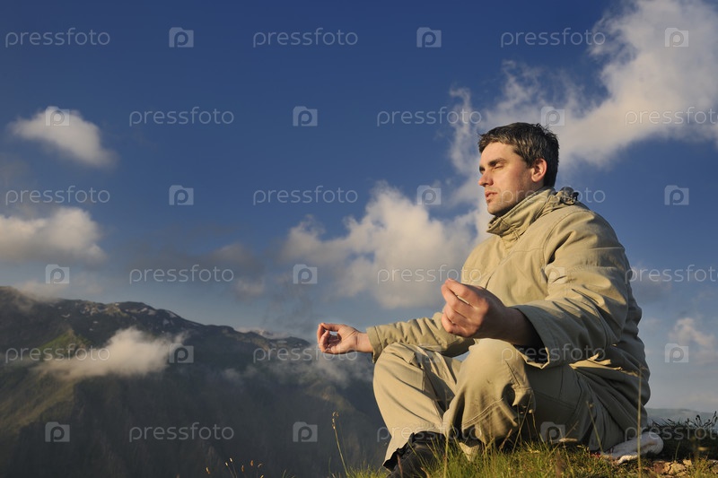 Здоровый мужчина занимается йогой ранним утром на вершине горы
