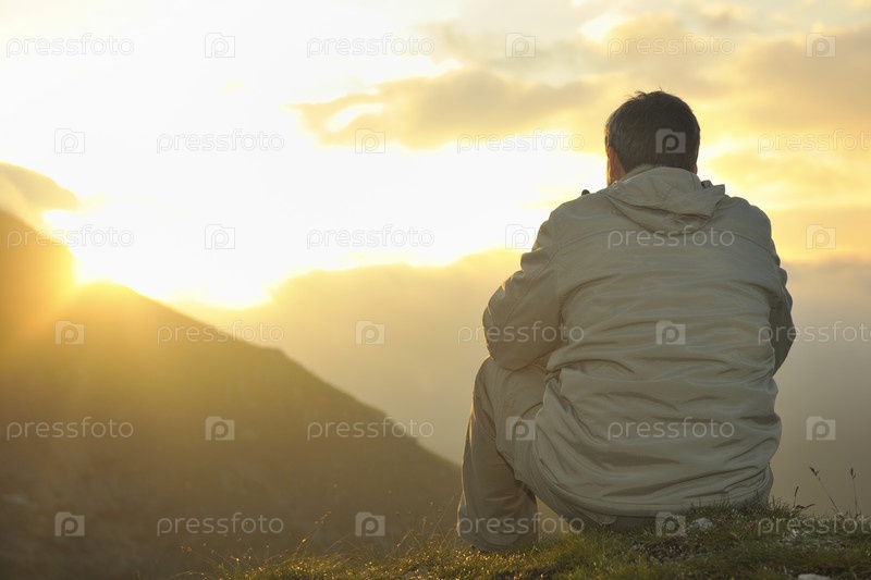 Мужчина занимается йогой ранним утром на вершине горы