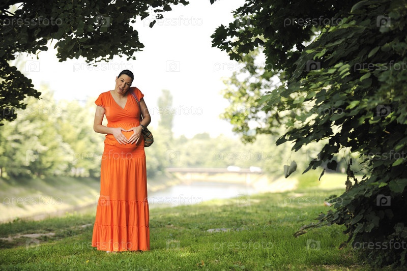 Молодая счастливая беременная женщина в оранжевом платье на открытом воздухе