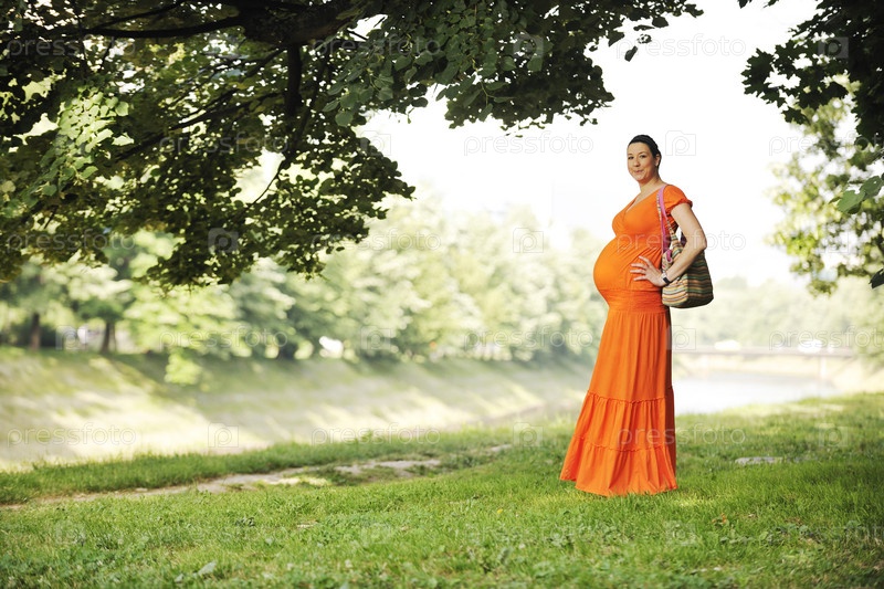 Молодая счастливая беременная женщина в оранжевом платье на открытом воздухе