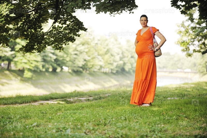 Молодая счастливая беременная женщина в оранжевом платье на открытом воздухе