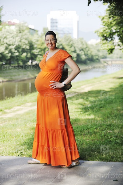 Молодая счастливая беременная женщина в оранжевом платье на открытом воздухе