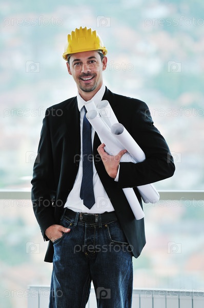 Успешный инженер-строитель в защитной каске и с чертежами в руке в помещении