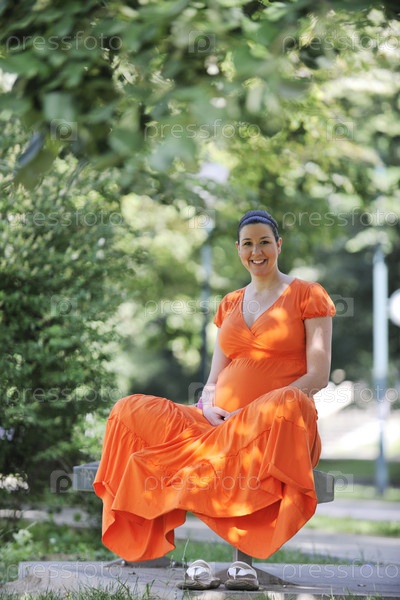 Молодая счастливая беременная женщина в оранжевом платье на открытом воздухе