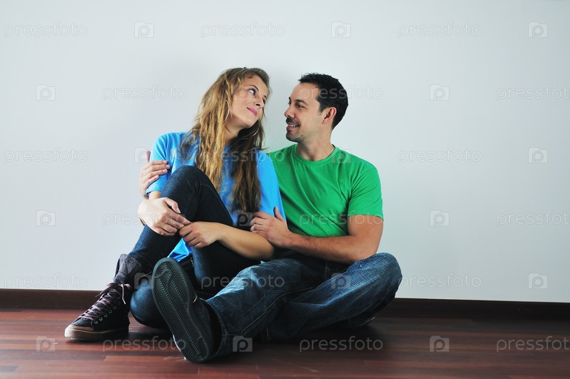 Молодая счастливая пара сидит на полу в своей новой квартире
