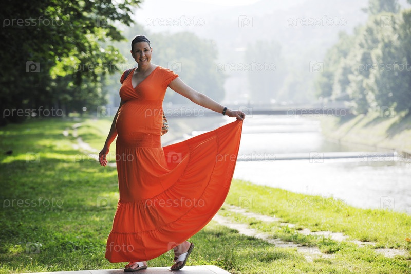 Молодая счастливая беременная женщина в оранжевом платье на открытом воздухе