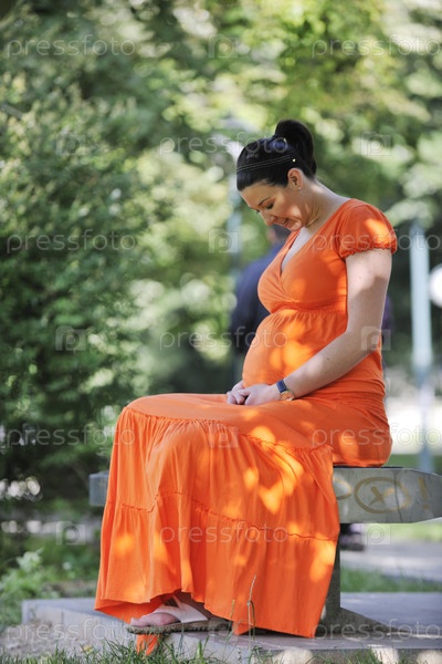Беременная женщина на скамейке в парке
