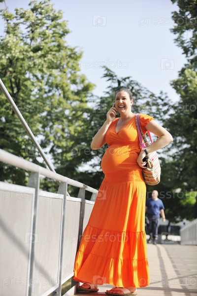 Красивая молодая беременная женщина на улице разговаривает по сотовому телефону