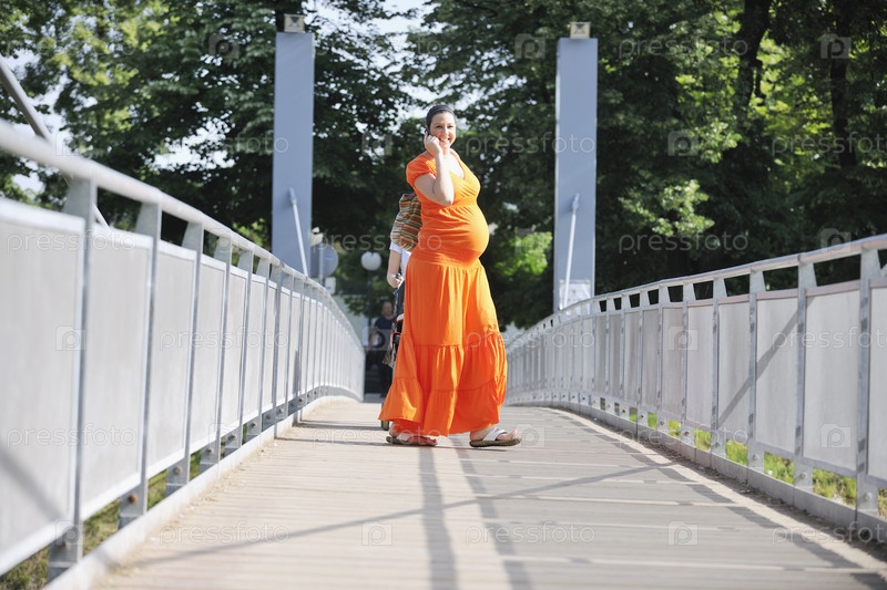 Красивая молодая беременная женщина на улице разговаривает по сотовому телефону