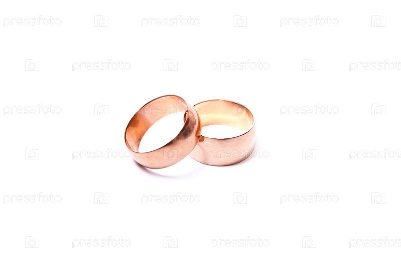 Два золотых обручальных кольца на белом фоне