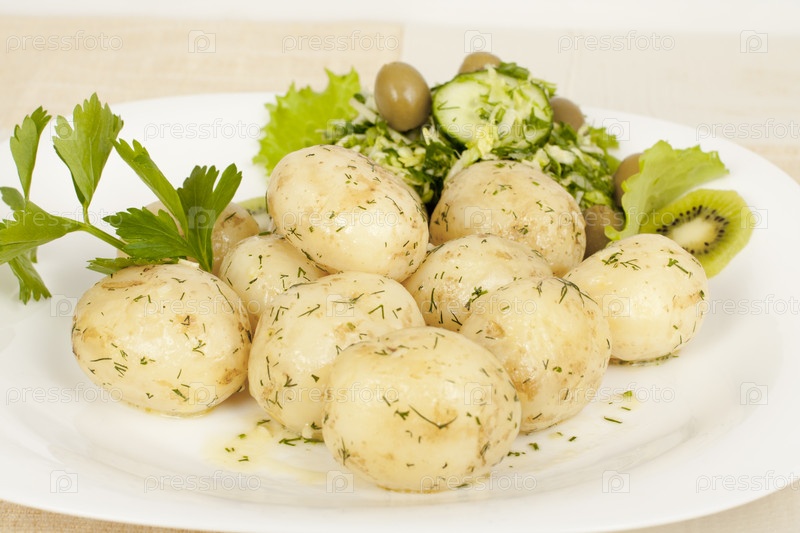 Отварной молодой картофель с укропом и салатом
