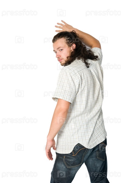 Молодой человек, стоявший, опираясь на стену на белом фоне