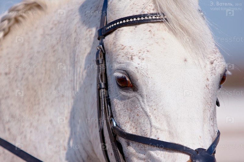 Морда белой лошади в уздечке