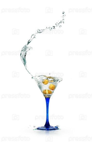 Бокал с брызгами мартини на белом фоне