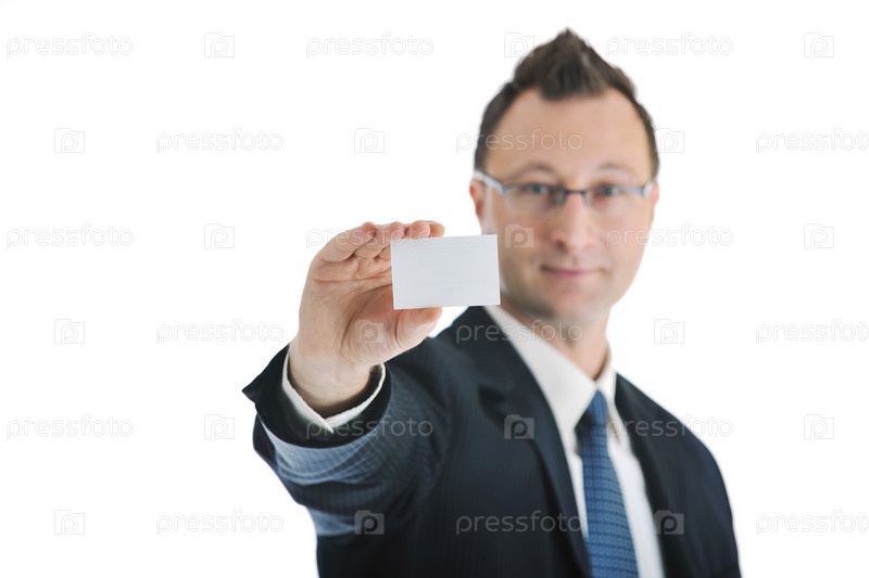 Портрет делового человека с визиткой на белом фоне