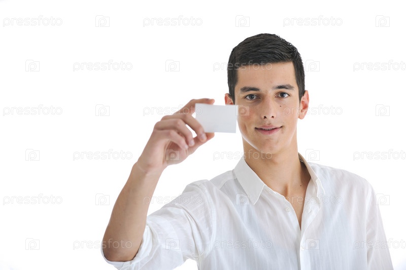Молодой мужчина с пустой визитной карточкой