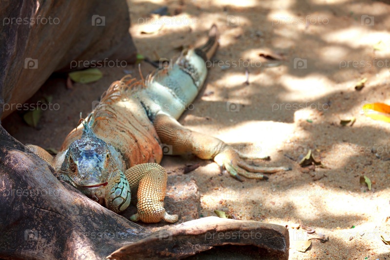 Большая ящерица на песке возле корня дерева