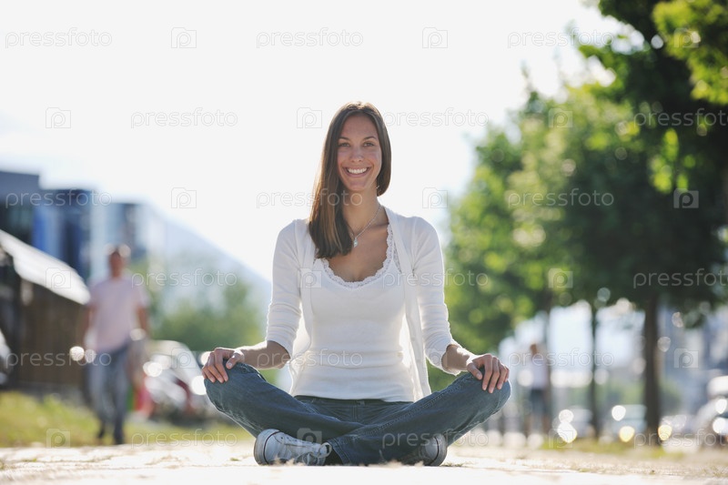Молодая женщина в позе лотоса сидит на тротуаре