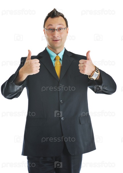 Счастливый молодой бизнесмен с большими пальцами вверх на белом фоне