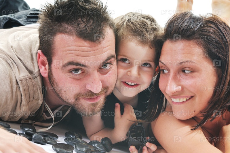 Счастливая семья из трех человек с массажными камнями
