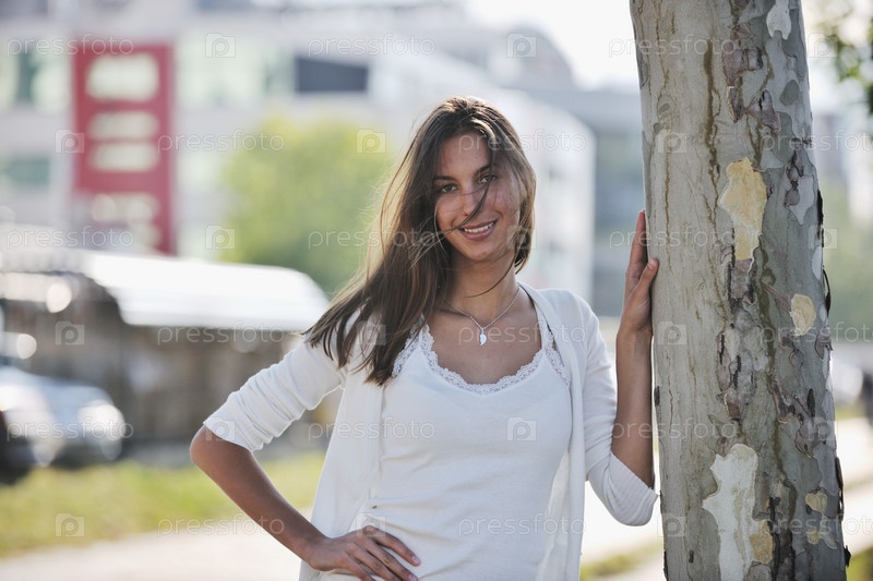 Привлекательная брюнетка стоит на городской улице возле дерева в солнечный день