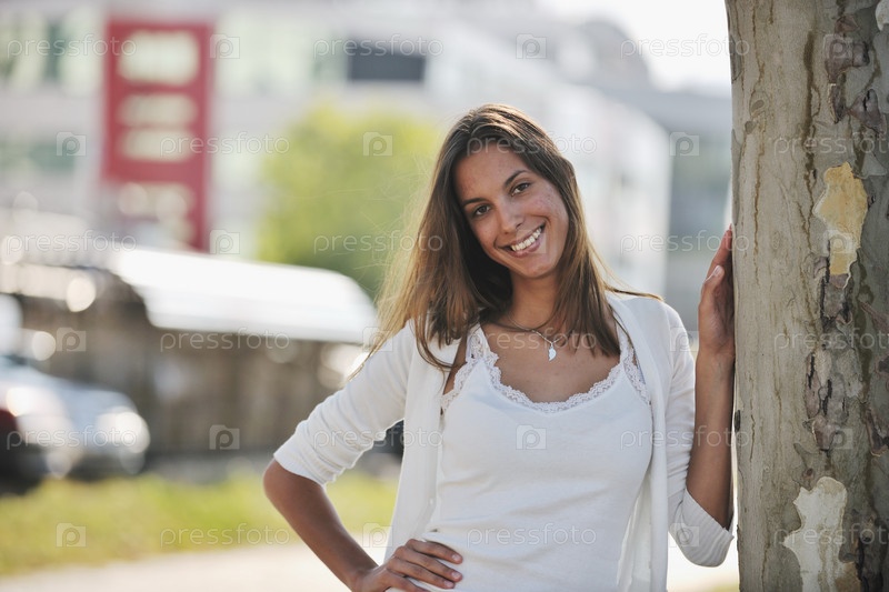 Привлекательная брюнетка стоит на городской улице возле дерева в солнечный день