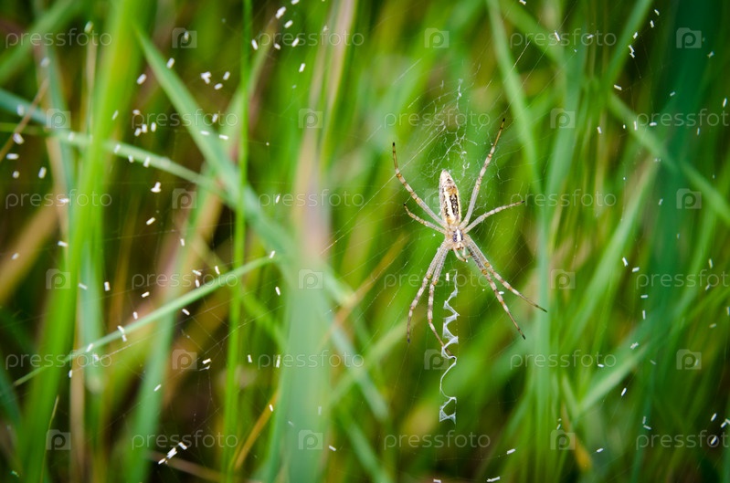Паук плетет паутину на фоне зеленой травы