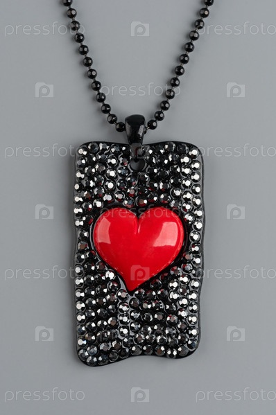 Кулон на черной цепочке с красным сердечком на сером фоне