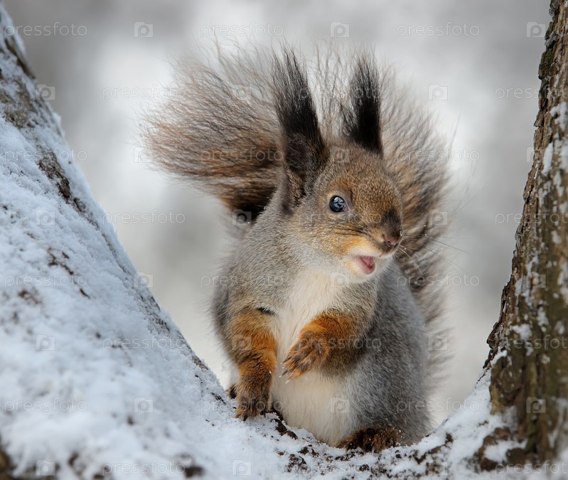 Белка сидит на дереве, покрытом снегом
