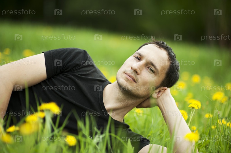 Молодой красивый парень лежит на траве