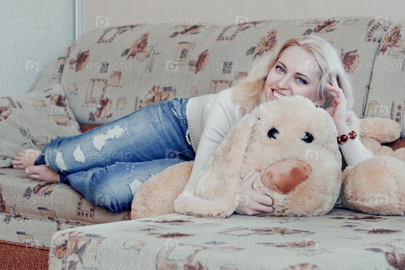 Девушка лежит на диване с игрушечной собакой