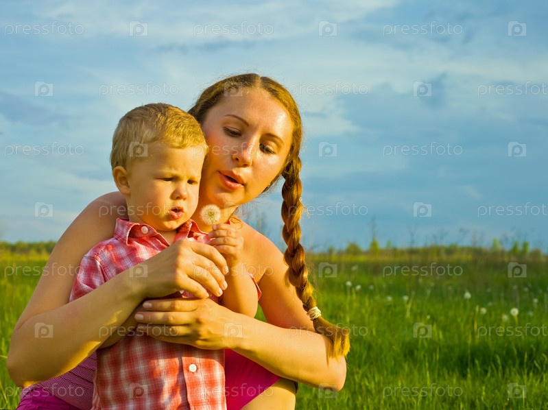 Мать и сын дуют на одуванчик на поляне