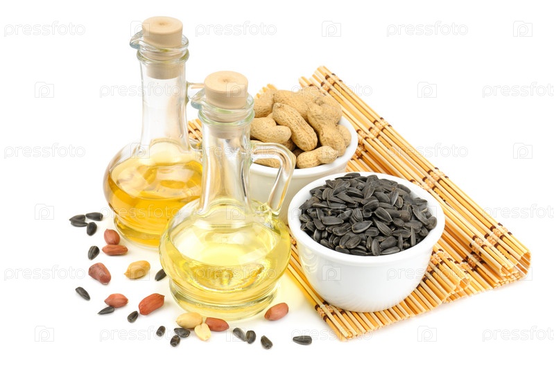 Бутылки с маслом, семечки и арахис на белом фоне