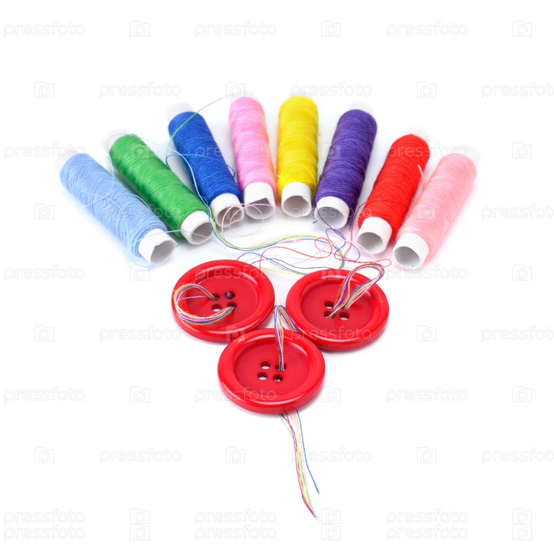 Красные пуговицы и катушки с разноцветными нитками на белом фоне