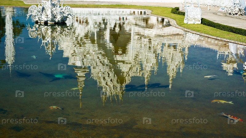 Отражение белого храма Ват Жун Кхун в пруду с рыбами,Таиланд