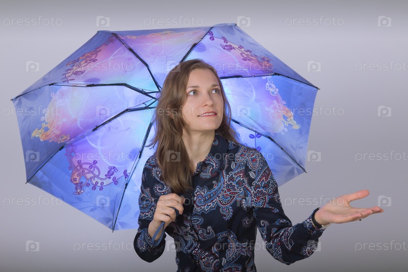 Молодая красивая женщина с зонтиком на сером фоне