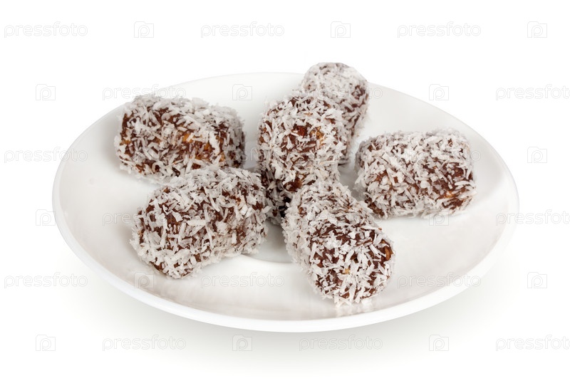 Шоколадное печенье с кокосовой стружкой на белом фоне