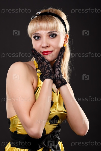Молодая танцовщица в желтом платье на черном фоне