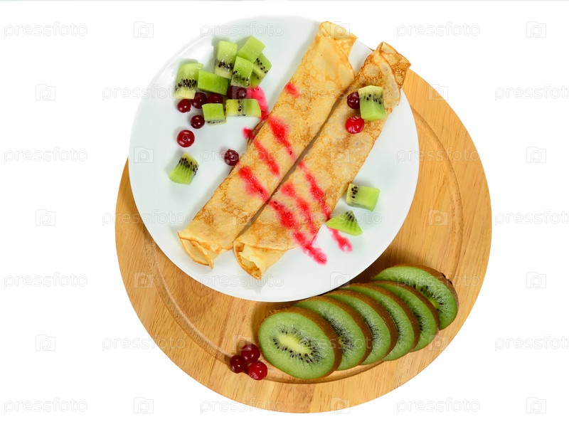 Блинчики с клюквой и ломтиками киви на белом фоне