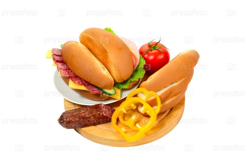 Сэндвичи, колбаса и овощи на белом фоне