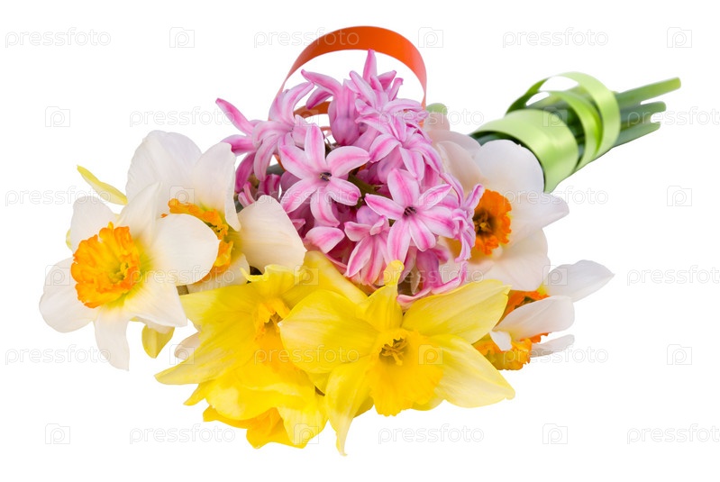 Букет нарциссов и розовых цветов с лентой на белом фоне