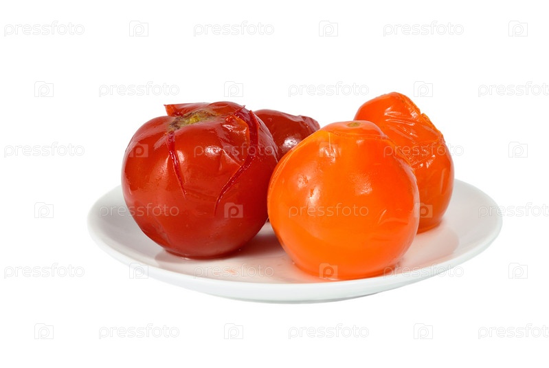 Соленые помидоры на тарелке на белом фоне