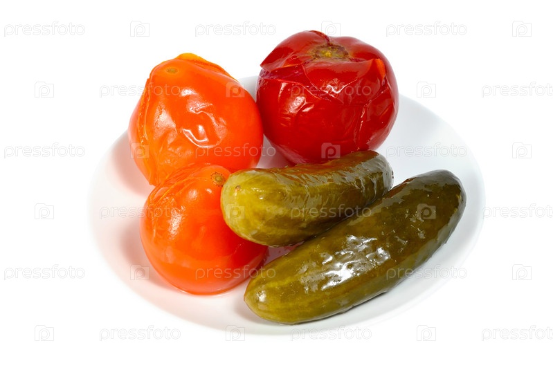 Соленые помидоры и огурцы на тарелке на белом фоне