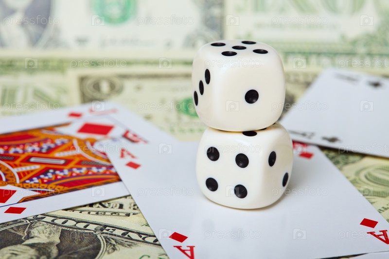 Две игральные кости на фоне карт и денег