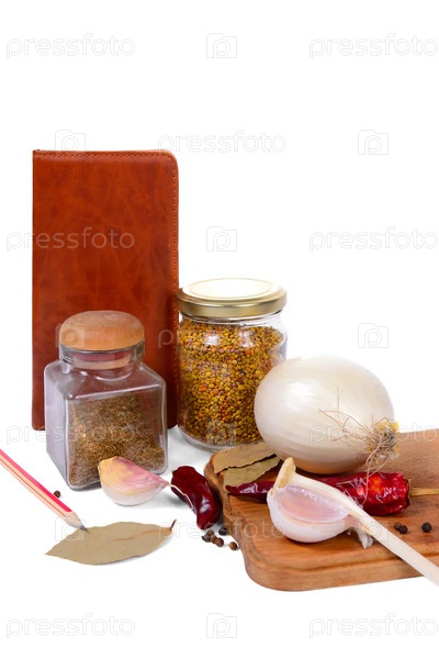 Овощи и специи с блокнотом для рецептов, изолировано на белом фоне