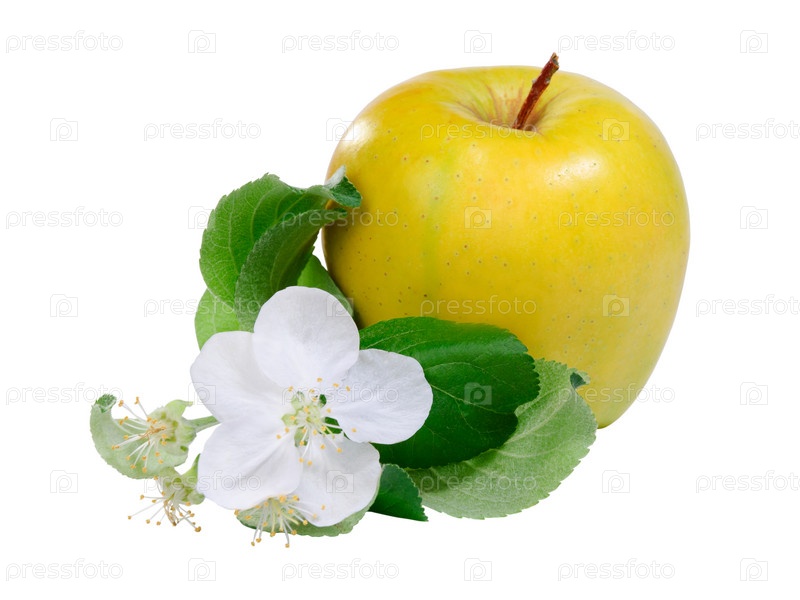 Желтое яблоко с цветущей веточкой на белом фоне